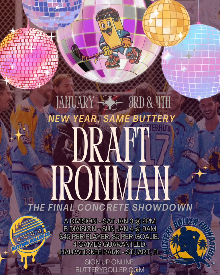 Sign Up below as a skater or goalie for the Buttery Roller Co New Year 2026 Draft Ironman - The Final Concrete Showdown! These are the last games that will ever be played on concrete at Halpatiokee Regional Park. Stilmat install begins January 5th!