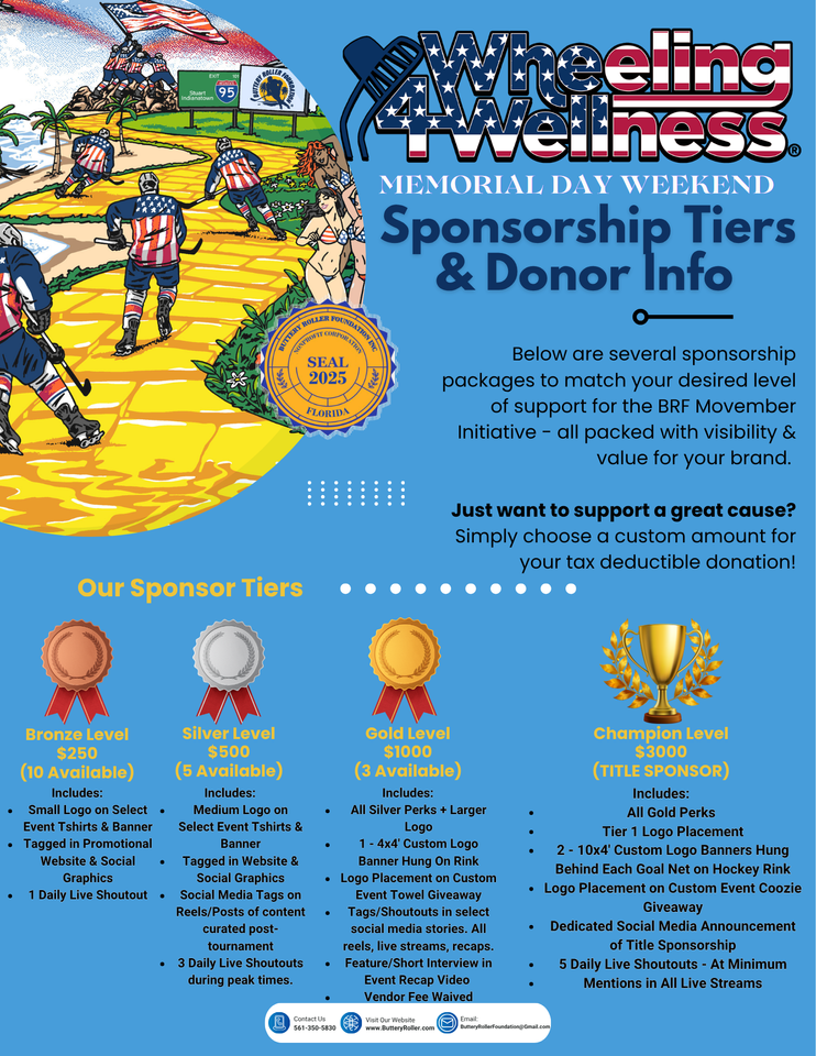 Your generous contribution will not only help a one of a kind event in south florida thrive, but more importantly - directly support united states veterans in our community, spread awareness for Mental Health Awareness month, bring together the community, and directly benefit two incredible charities bettering the lives of their members, effecting change in their communities and beyond every day; THE FLORIDA PANTHERS WARRIORS FOUNDATION and THE BUTTERY ROLLER FOUNDATION!